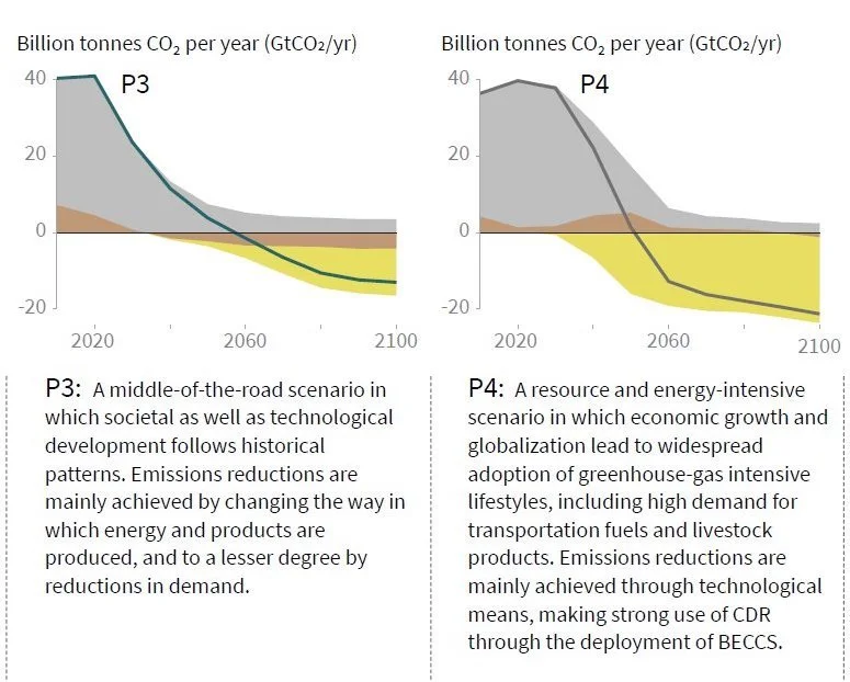 Emission pathways showing reliance on carbon removal, from IPCC SR15 2018, Summary for Policymakers.